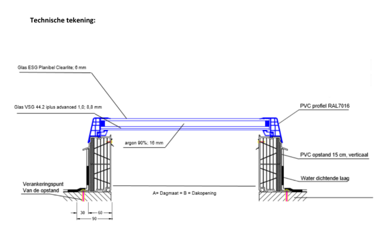 Een platdakraam wordt vaak met een rechte opstand uitgevoerd. Hierdoor is de daksparing van het vierkante platdakraam Lightwing2 70×70 ook exact 70×70. Dit is goed om te weten voor het plaatsen van de dakbalken. De vlakke lichtkoepel, zoals een platdakraam ook wel wordt genoemd, is ook uit te voeren met een schuine PVC opstand. De daksparing is dan +20cm net als bij de meeste lichtkoepels. De daksparing van het vlakke glasraam wordt dan 90x90cm. Standaard voeren we de Lightwing2 uit met een rechte opstand.