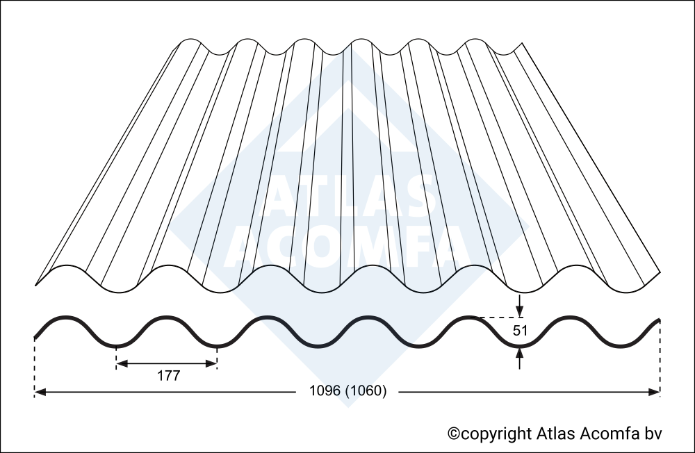 Het golftype 177/51 is de grote golf en is een veel verkochte golfplaat. Waar staat het type 177/51 eigenlijk voor? In het artikel Hoe meet ik de golfafstand en golfhoogte, wordt hier verder op ingegaan. De 177mm staat voor de hart op hart afstand van de golven en de 51mm staat voor de hoogte van de golf. Het golftype 177/51 sluit uitstekend aan op vezelcementdaken en door de ammoniakbestendigheid van de polyester golfplaten is het een veelgebruikte golfplaat in de agrarische sector.